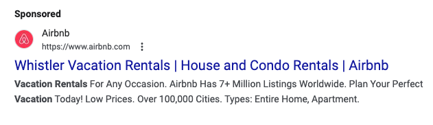 This ad may be above yours in the search ranking, but you’ll still see high click rates by writing ad text that is engaging and specific to search terms. Speak to the destination and features, amenities, and inventory. You know your market infinitely better than the OTAs, so use this to your advantage! Potential guests are often searching more specific terms, and these ads have also been shown to have a higher conversion rate than general searches over a broader area.